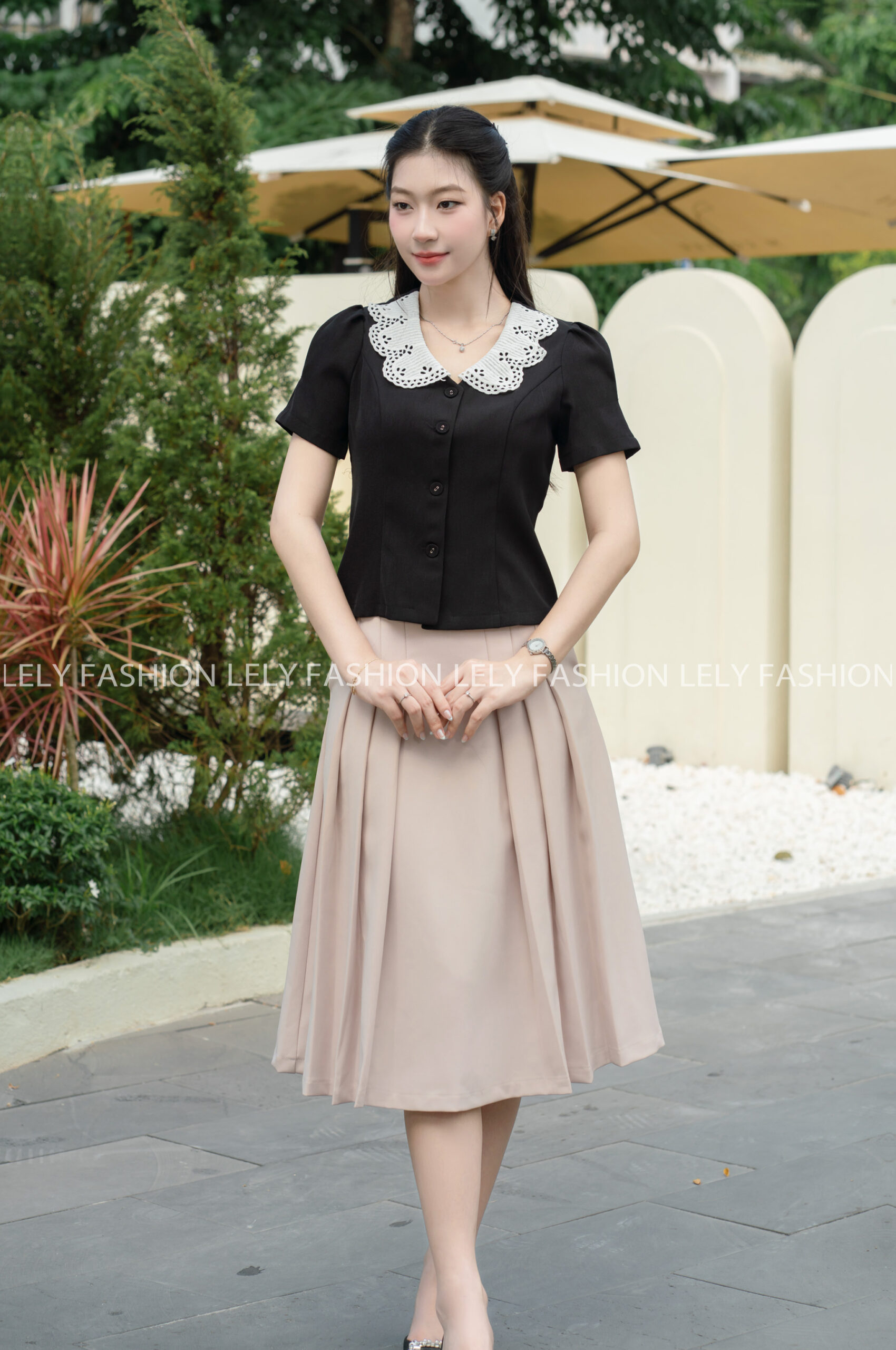 Đặc biệt, khi được kết hợp cùng một chiếc chân váy Dáng A Đai Xếp Ly, sự tương phản màu sắc cùng với thiết kế ôm eo gọn gàng của áo sẽ tạo nên một tổng thể tôn dáng tuyệt đối. Chiếc áo sơ mi với form chiết eo giúp định hình vòng hai, trong khi chân váy tạo độ bồng bềnh quý phái, kéo dài đôi chân và tạo cảm giác vóc dáng đồng hồ cát hoàn hảo. Sự phối hợp này không chỉ làm nổi bật chi tiết ren và tay áo bồng nhẹ của áo sơ mi mà còn mang lại vẻ ngoài sang trọng, chuẩn mực và đầy sức hút cho mọi quý cô công sở.