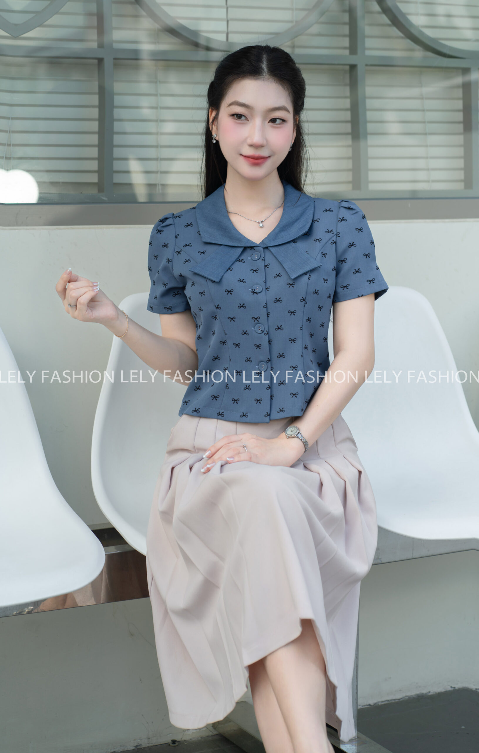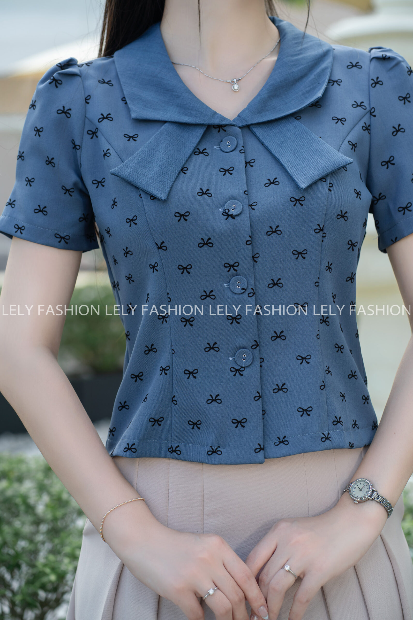 Thiết kế cổ nơ tiểu thư phối màu nổi bật, tôn lên nét thanh lịch và nữ tính.