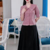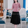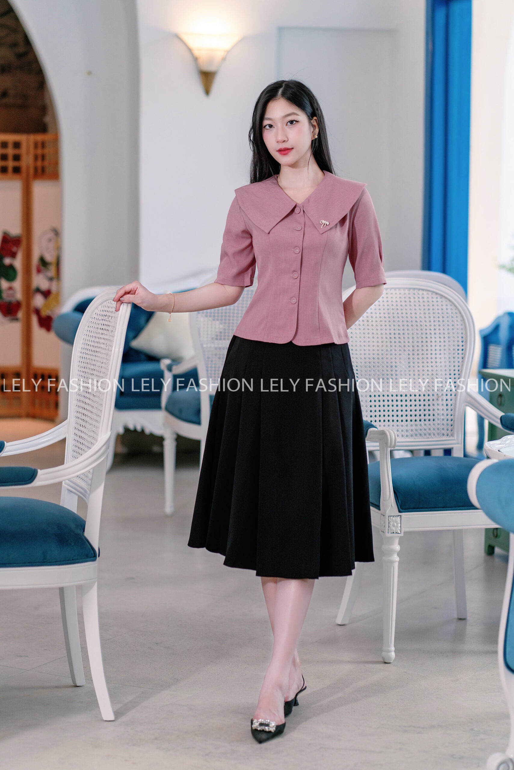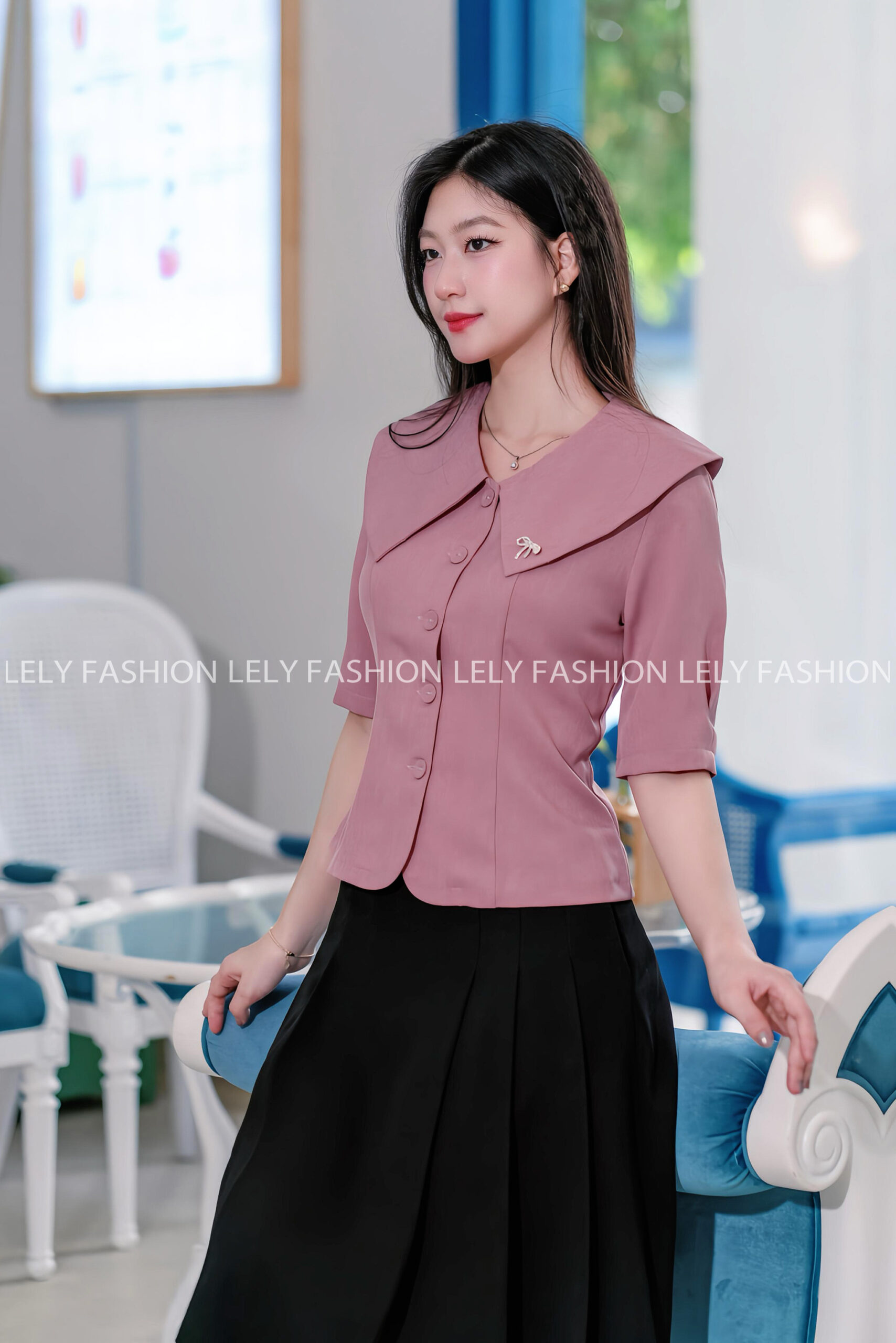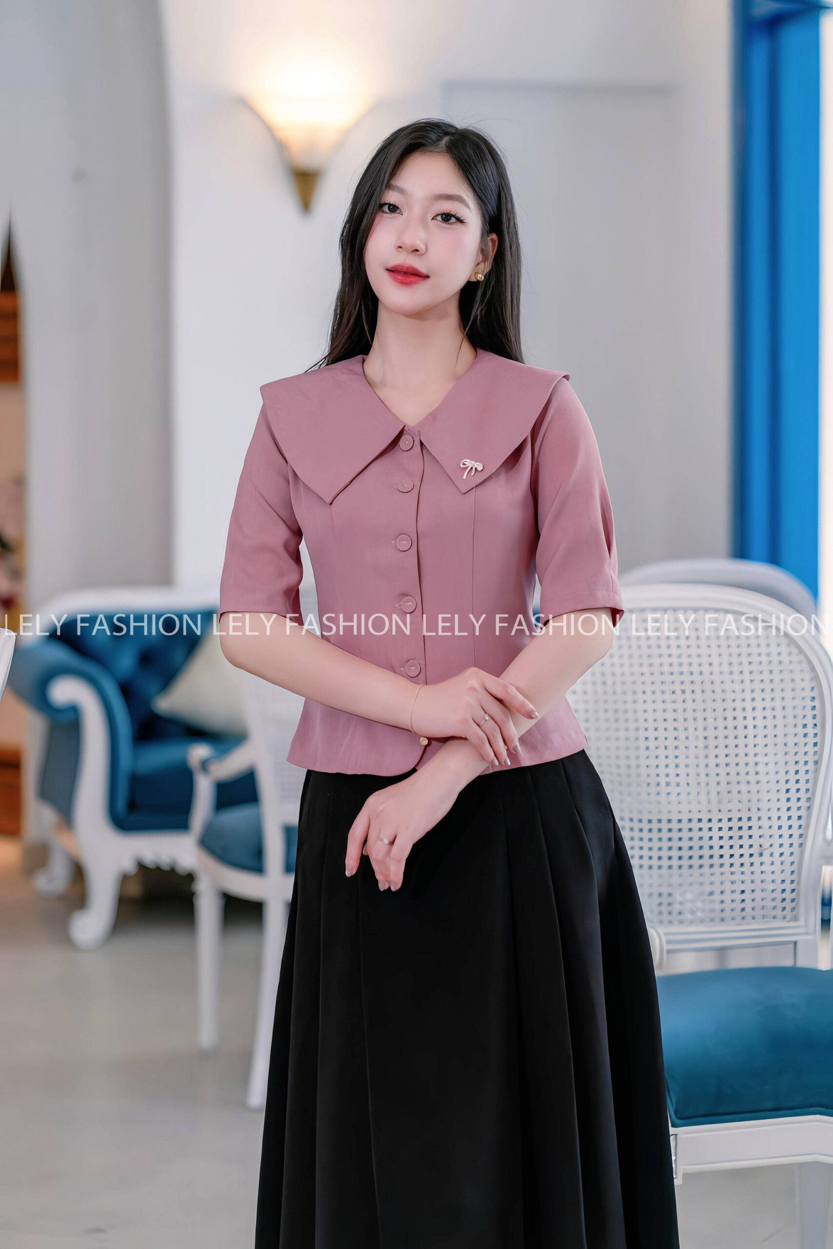- Thiết kế: Sơ mi cổ sen lớn cách điệu, ngực ghim nơ đá tinh tế